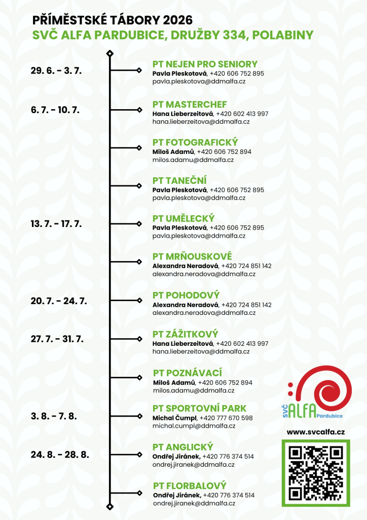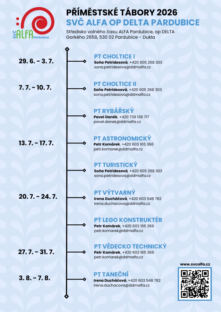 Podívejte se na termíny příměstských táborů 2026 na odloučeném pracovišti DELTA na Dukle a hlavním pracovišti ALFA v Polabinách.